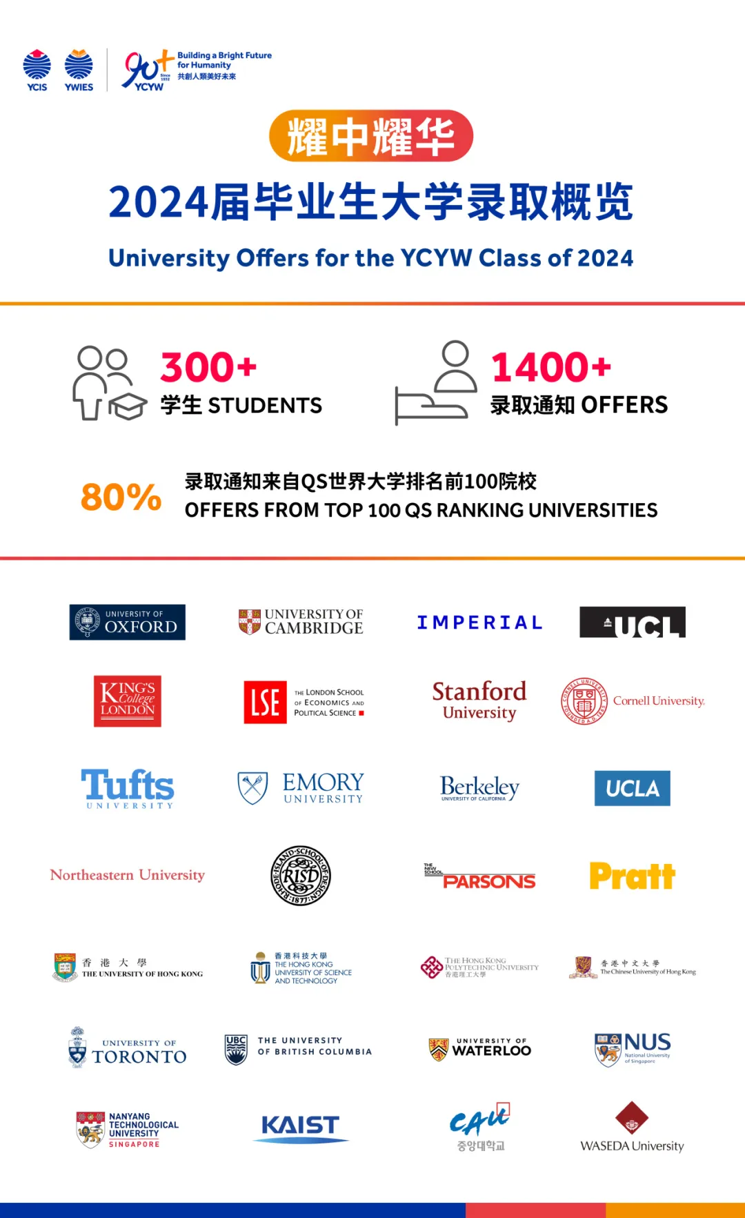 耀中耀华 2024 届毕业生共获得 1400 余份大学录取通知,其中 80% 来自 QS 世界排名前100的大学,包含剑桥大学、牛津大学、斯坦福大学、帝国理工学院等顶尖名校,显示出耀中耀华教育质量的强大竞争力。