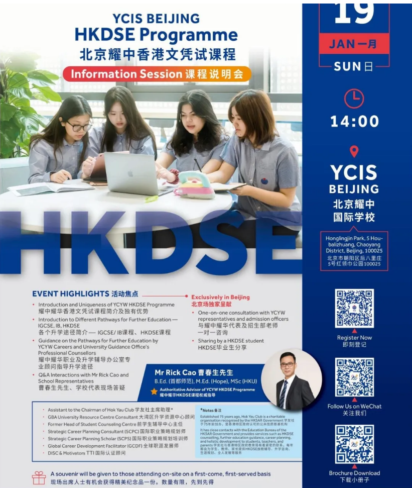 1月19日,我们将在北京耀中举办HKDSE课程说明会。说明会详情请参考下方海报,我们诚挚欢迎有意向的家庭进行预约咨询,深入了解HKDSE课程及升学规划,亲身体验北京耀中的校园环境及学习氛围。