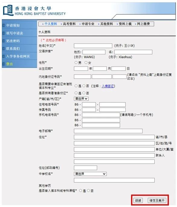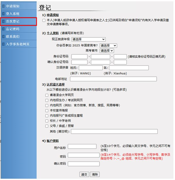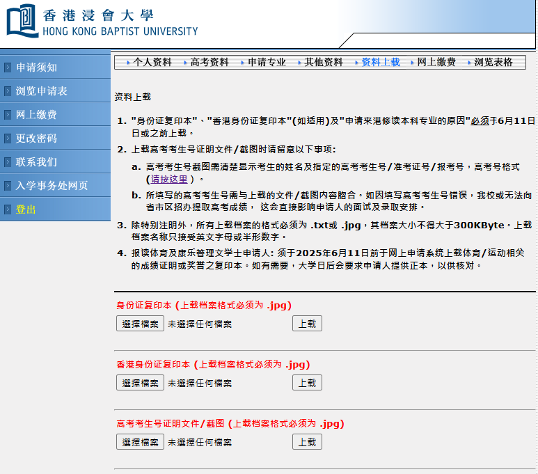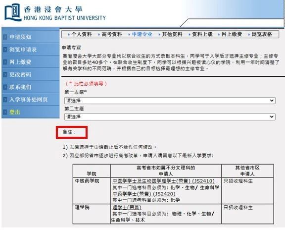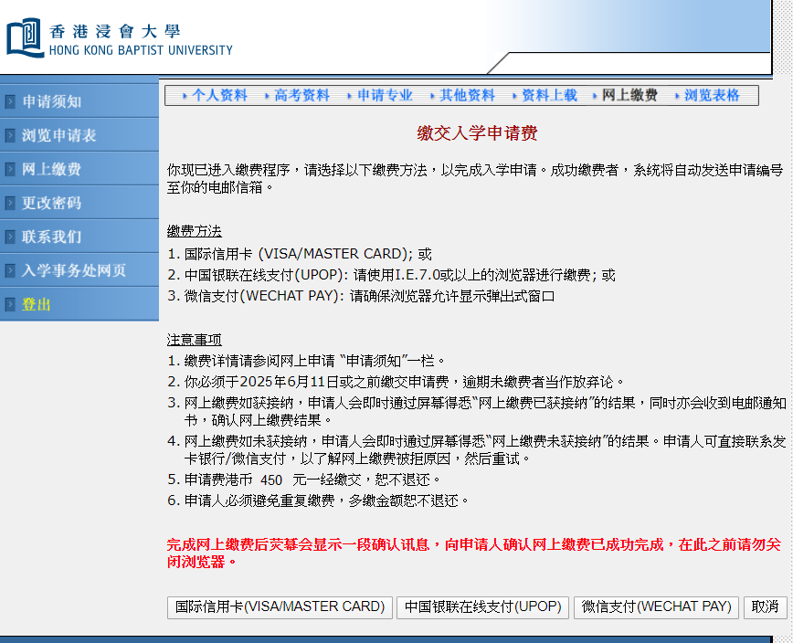 浸大采取独立招生,有意报读者须直接向大学递交入学申请,根据国家教育部规定,所有已确认接受录取的同学,内地高校将不再录取。申请人可登入网上申请系统,并根据指示完成以下手续:填妥申请表并上载有关证明文件。以国际信用卡(VISA/MASTER Card)﹑中国银联在线支付(UPOP)或微信支付(WECHAT PAY)网上缴费,费用港币450元。