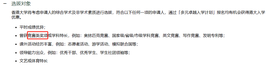 符合上图任何一项的同学就可以申请多元卓越入学计划,在多元卓越入学计划中表现优秀者,可获得香港大学本科生入学的加分优惠。表现特别突出的申请人,则会在高考前,获得香港大学有条件录取(Conditional Offer)。