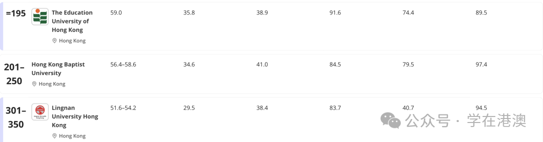 中国香港共有八所上榜高校,其中两所为今年新上榜:香港教育大学和香港岭南大学。其余六所大学排名均有所提升,使中国香港成为全球唯一拥有至少三所上榜高校且所有上榜高校排名都有所上升的地区。