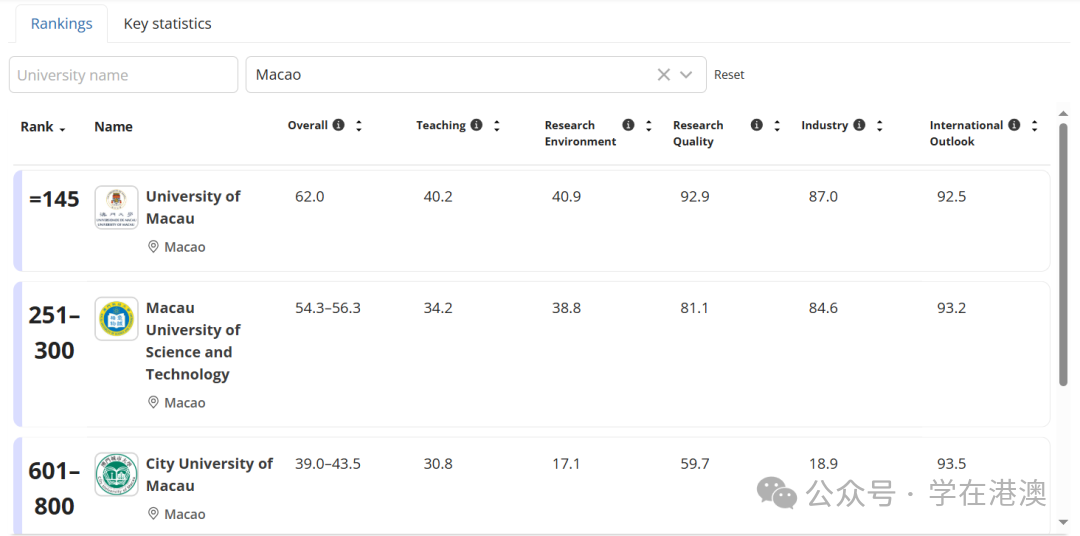 中国澳门排名最高的院校是澳门大学,位列世界第145名,较去年上升35位,创历史最佳成绩,首次跻身世界前150强。澳门科技大学位列世界第250-300排名区间。