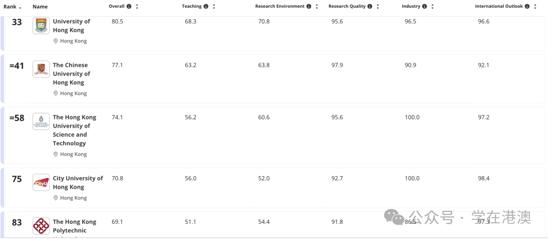 中国香港院校排名提升主要得益于教学声誉、授予博士学位/授予学士学位比例及生师比的进步。这表明中国香港高校正逐步转向研究型大学,并加大对学术人员及博士研究的投入力度。