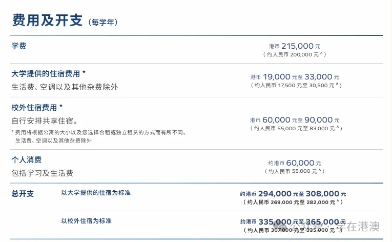 1、STEM学院:每学年学费24.9万港币(含牙医、工程、李嘉诚医学院及理学院、生物医学工程、计算与数据科学及创新学院),较去年学费涨3.1万,四年合计99.6万港币。2、非STEM学院:每学年学费22.4万港币(含建筑、文学、经管、教育、法律及社会科学学院),较去年学费涨2.6万,四年合计89.6万港币。