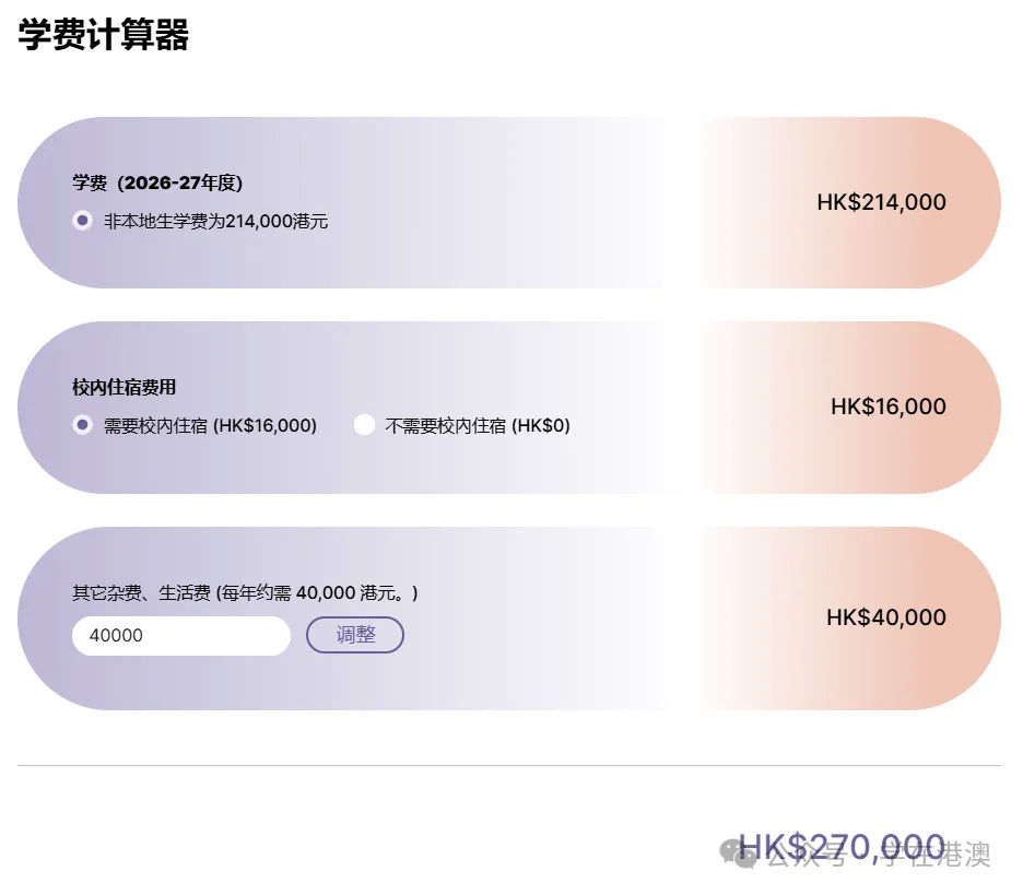 香港中文大学2026-27年度的非本地生每年的学费为214,000港元。住宿费约16,000港元,其它杂费、生活费每年约需40,000港元。一年一共需要270,000港元,约等于24.7万人民币。对比去年学费每年17.8万港币,港中文学费每年暴涨3.6万港币(约3.3万人民币),涨幅高达20%!