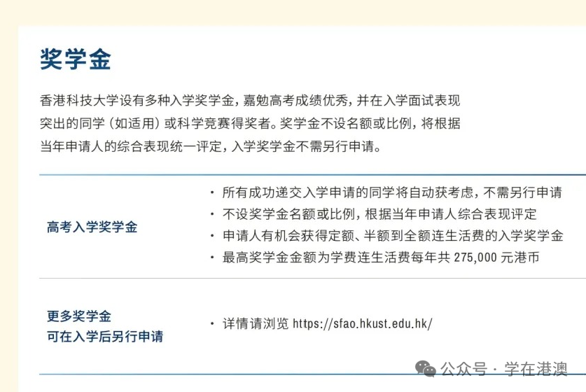 高考成绩优秀,并在入学面试表现突出的的基础上增加了科学竞赛得奖者可获奖学金,最高金额从25年的245000增加到275000。科学竞赛获奖者竞赛级别如下;国际奥林匹克金牌-免学费+60000港币,银牌-免学费,亚洲奥林匹克金牌-免学费+30000港币。