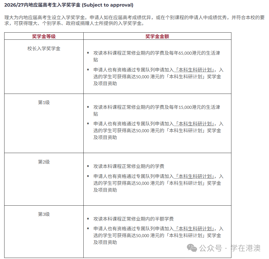 不过,港理工的入学奖学金也非常可观,共4档,详情如下: