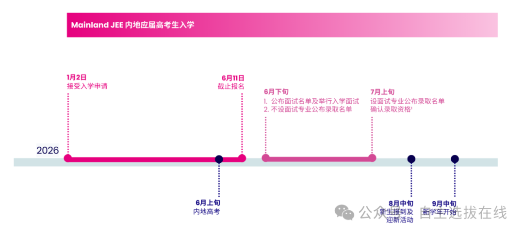 申请时间从2026年1月2日开始,至6月11日截止。所报专业在6月11日后将不能更改,请申请人慎重选择。大学将在2026年7月上旬发出录取通知。若考生在7月7日仍未收到录取通知,则可视为落选,大学不再另函通知。