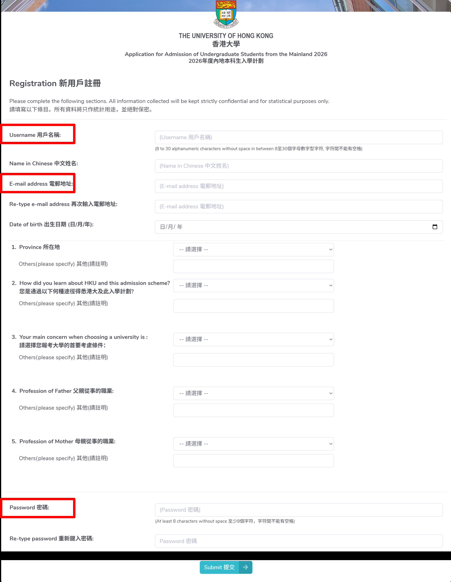 2.3 按实际情况填写信息,填写完毕后点击“提交”,*请牢记用户名、密码以及邮箱,以便日后登入申请系统,查看申请进程。