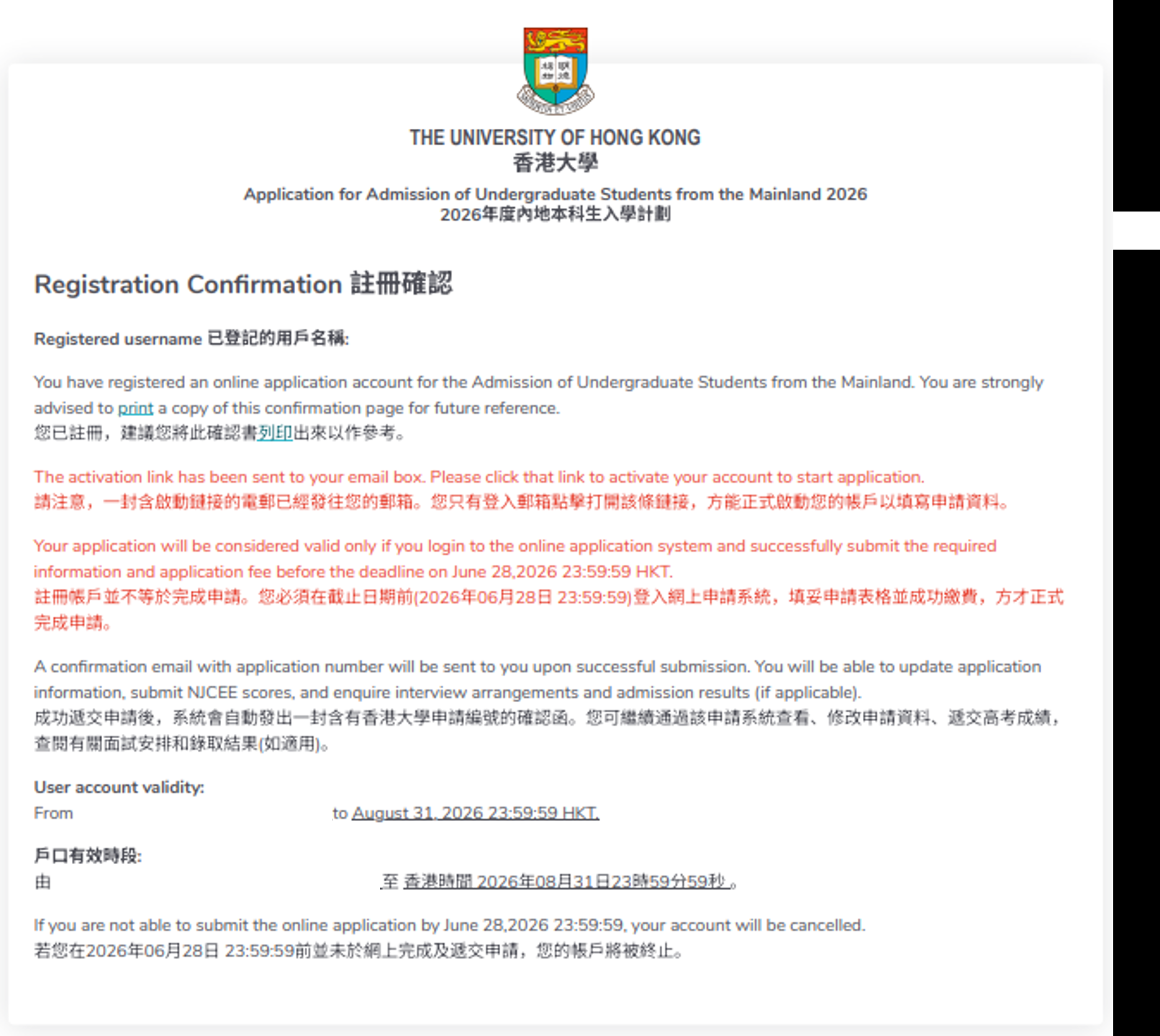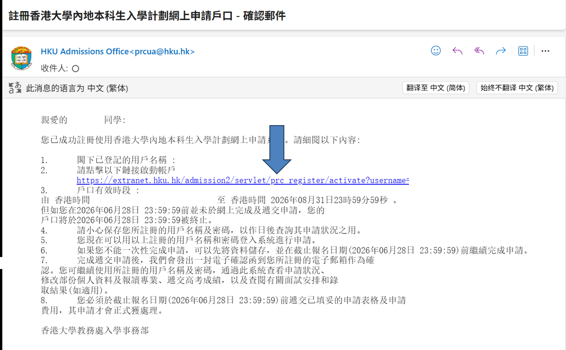 2.5 同时,注册邮箱会收到一封账户启动邮件,请点击邮件中链接以启动账户。*如没有收到邮件,请检查垃圾邮件,并将 prcua@hku.hk 添加入邮箱白名单。如仍无法解决,请更换邮箱地址重新注册。