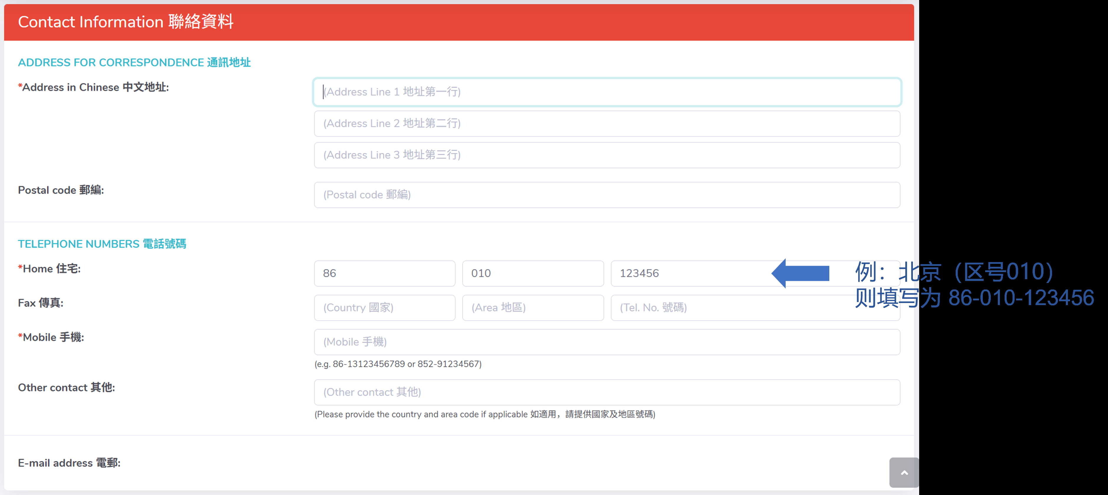 3.3 住宅电话请填写家庭固定电话号码,所有于内地报名的学生请填写中国国家号:86
