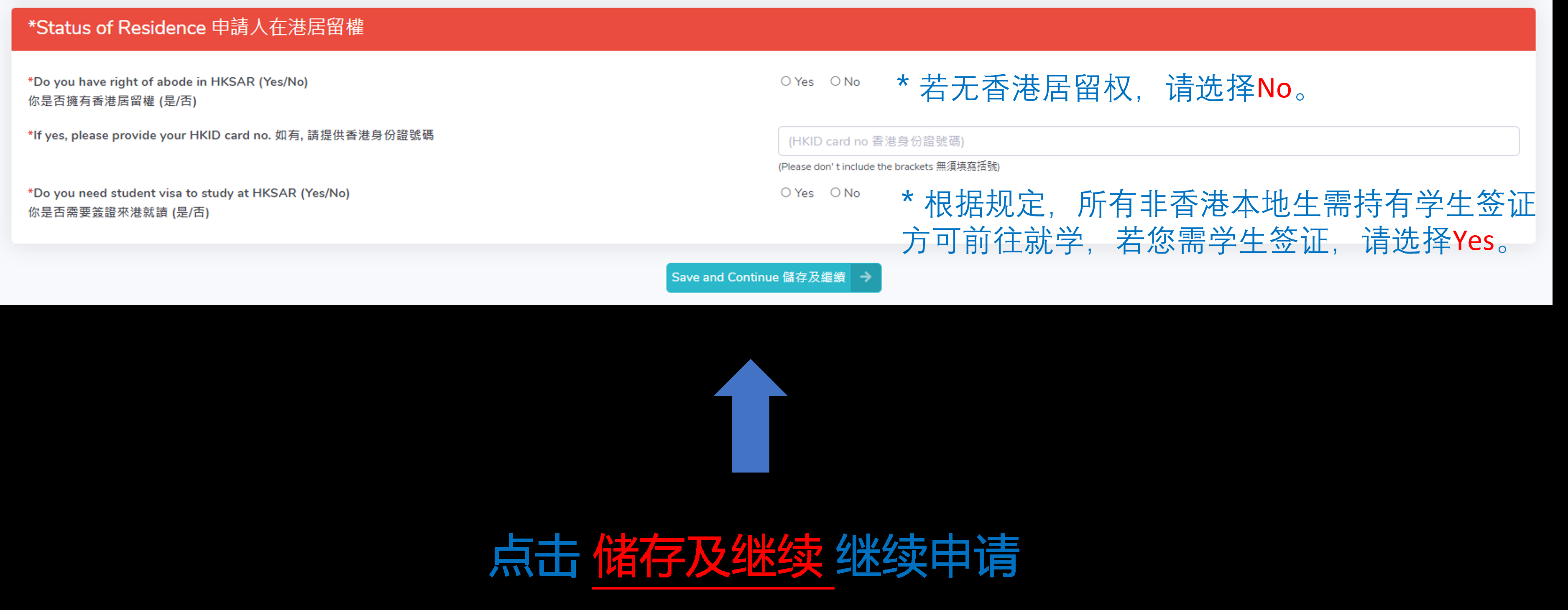 3.5 根据实际情况选择学生在港居留权,点击储存及继续,* 若无香港居留权,请选择No。** 根据规定,所有非香港本地生需持有学生签证方可前往就学,若您需学生签证,请选择Yes。