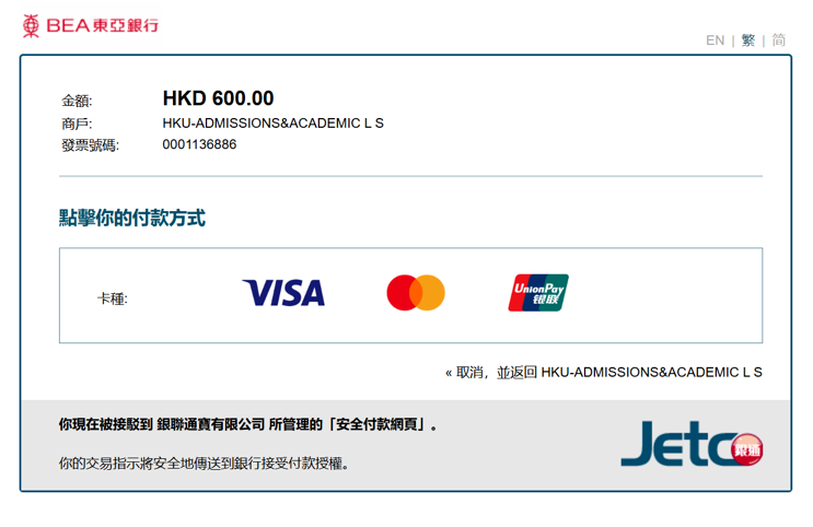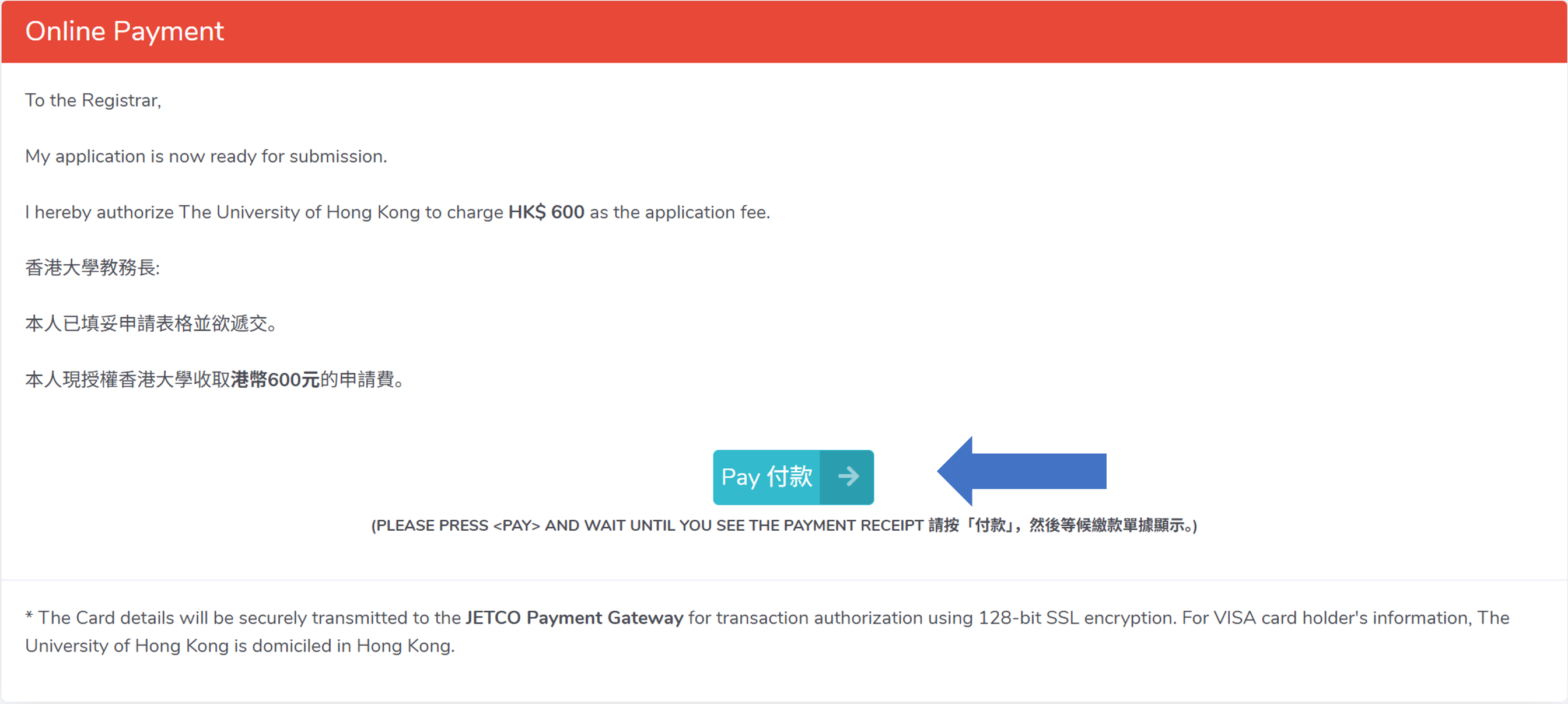 完成付款后,您将收到一封确认邮件,包含十位数的申请编号(如:15XXXXXXXX),以及付款参考号码;