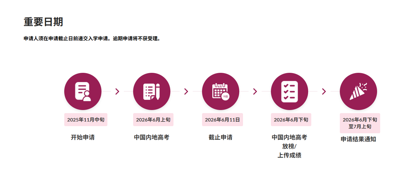 根据招生简章,香港城市大学2026年内地本科生申请将于2025年11月中旬开始。申请通道开放后,考生需通过港城大官方网站直接提交入学申请。申请截止日期为2026年6月11日。申请人必须在此日期前递交入学申请,逾期申请将不获受理。对于暂时没有高考考生号/准考证号的申请人,可在获得相关信息后,于2026年6月11日前登录网上申请系统补充填写并上传相关证明文件。