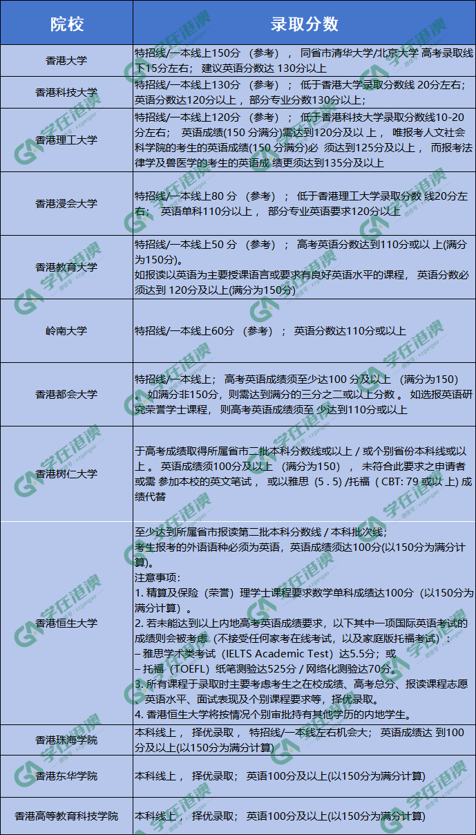 香港教育大学的分数参考线约为特招线上50分,英语基础要求为110分,若报读以英语授课为主的课程则需120分以上。岭南大学要求总分超过特招线约60分,英语需110分或以上。香港都会大学则要求考生成绩达到特招线/一本线,英语至少100分(满分150分制),其中报考英语研究课程需达到110分。