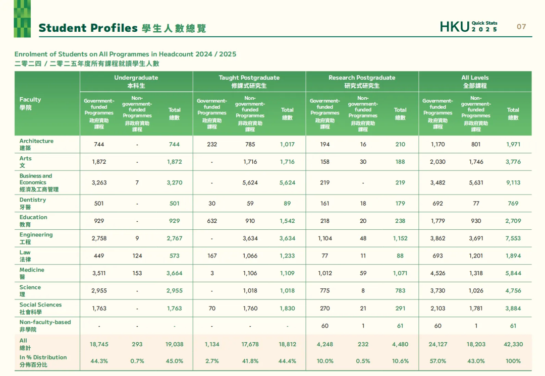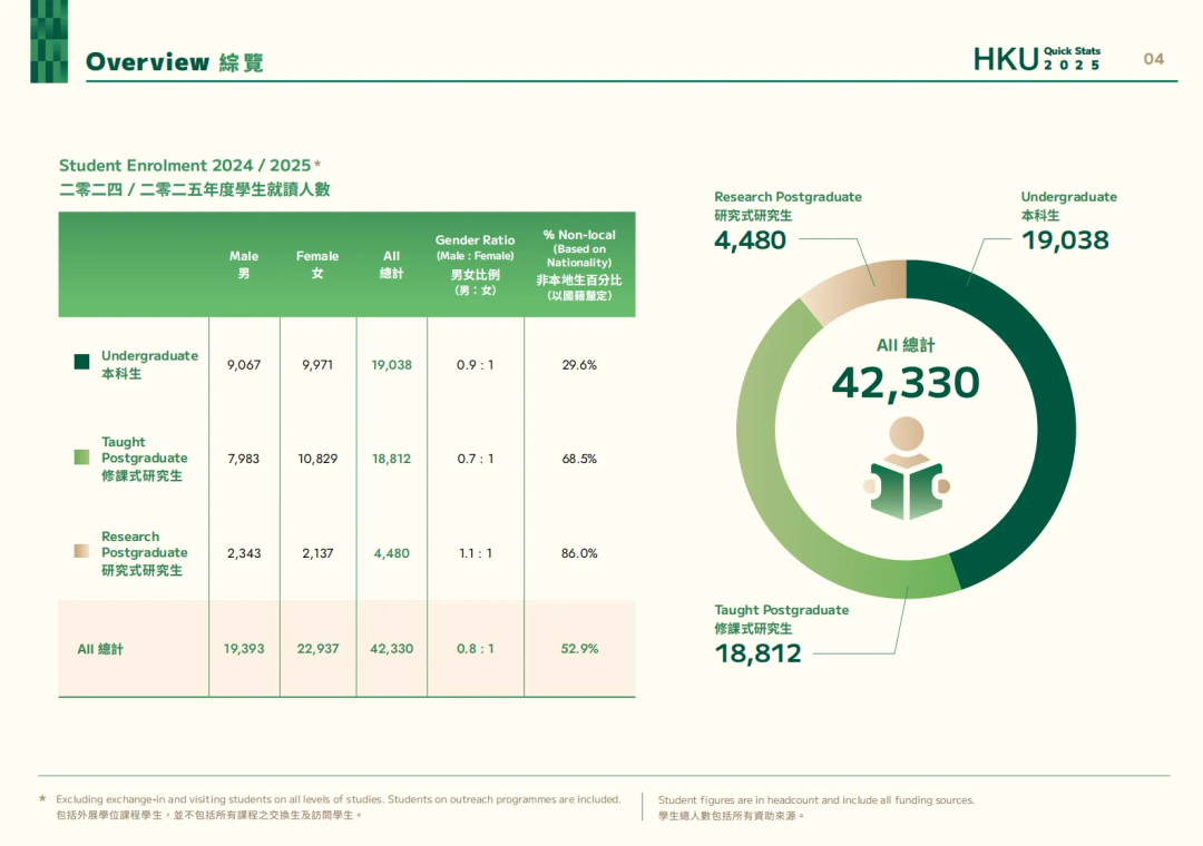 2024/25学年,香港大学在校学生总数为42,330人,其中本科生为19,038人,其余均为研究生阶段学生。根据历年数据来看,港大学生数量呈逐年上升趋势,2024/25学生总数比上一学年的39,166人新增了3,164人,目前在所有港大学生中,非本地生占比为52.9%,已超过总数的一半,反映港大的国际化程度越来越高了!