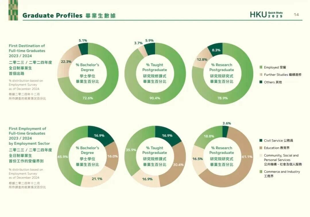 数据显示,2023/24学年港大本科毕业生中,72.6%选择直接就业,22.3%选择继续攻读研究生课程,剩下的5.1%则选择了其他。投身职场的毕业生遍布各行各业,包括工商企业、公共部门、社会服务、教育领域等。以上数据不仅显示了港大学子的高竞争力,也表明他们在职场上的多样化发展。
