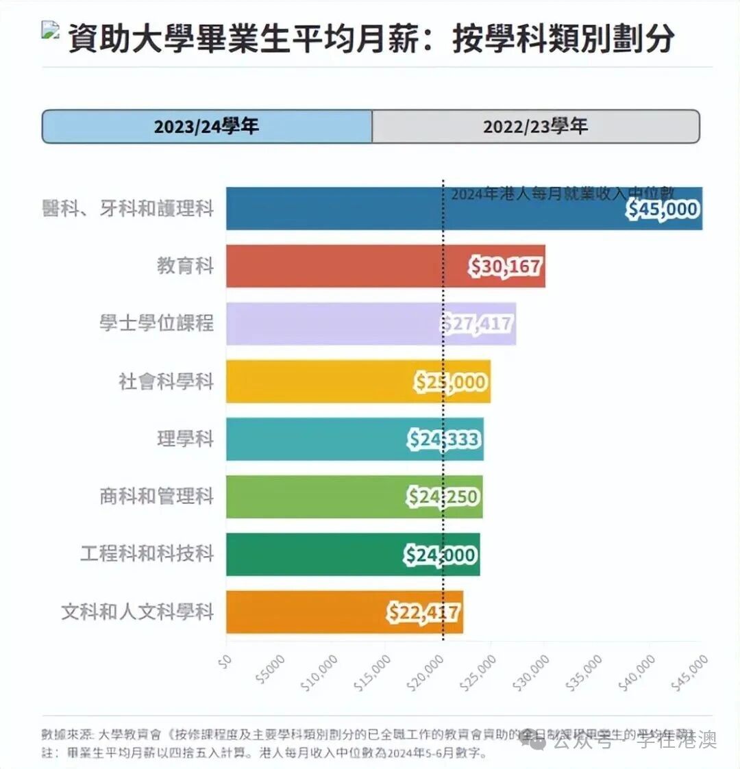 根据大学教资会发布的《按修课程度及主要学科类别划分的已全职工作的教资会资助的全日制课程毕业生的平均年薪》数据,2023/24学年学士学位课程各学科毕业生的平均月薪资约为2.2万元至4.5万元。