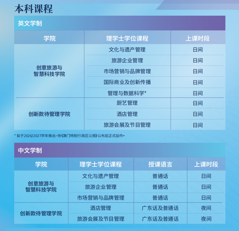 澳门旅游大学2026年内地本科生课程