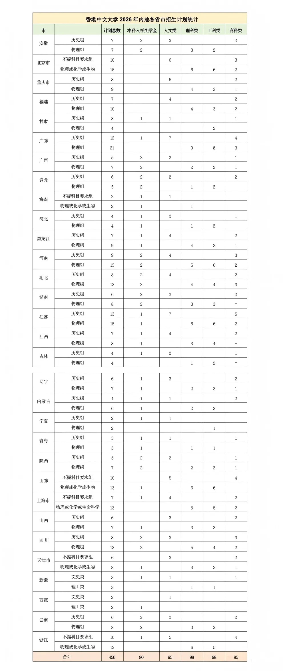 · 港中大面向全国31个高考省、市、自治区招生,各省设有招生计划。
