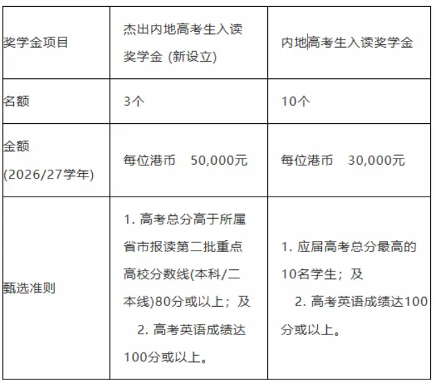 为吸引更多优秀内地高考生来港升学,东华学院为2026/27学年入学的新生提供多项奖学金。除了保留原有的内地高考生入读奖学金外,更增设全新的杰出内地高考生入读奖学金,以嘉许学业成绩卓越的同学圆梦香港!