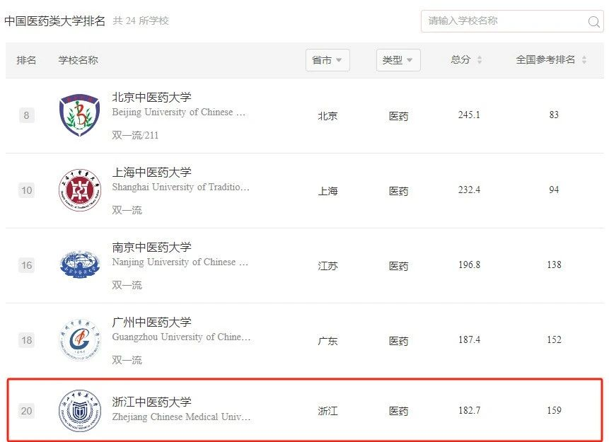 浙江中医药大学在2024软科中国大学排名中位列全国中医药院校第5位