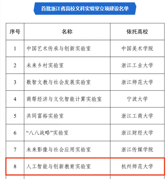 近日,浙江省教育厅发布了《浙江省教育厅关于公布首批浙江省高校文科实验室立项建设名单的通知》,我校申报的“人工智能与创新教育实验室”获首批浙江省高校文科实验室立项建设。