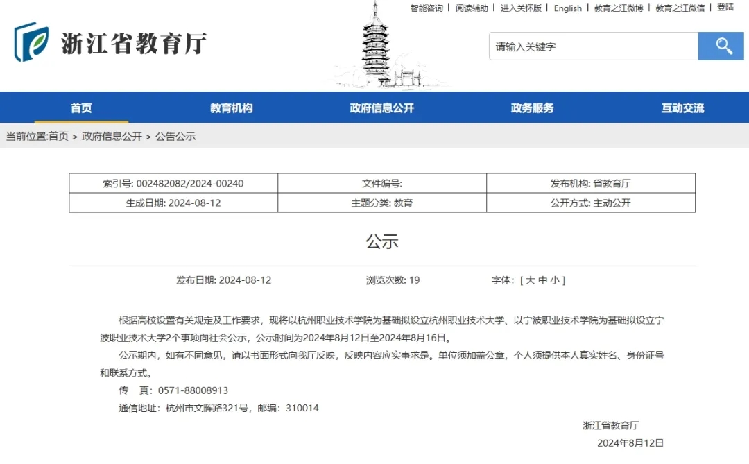 8月12日,浙江省教育厅发布公示文件,根据高校设置有关规定及工作要求,现将以杭州职业技术学院为基础拟设立杭州职业技术大学、以宁波职业技术学院为基础拟设立宁波职业技术大学2个事项向社会公示,公示时间为2024年8月12日至2024年8月16日。