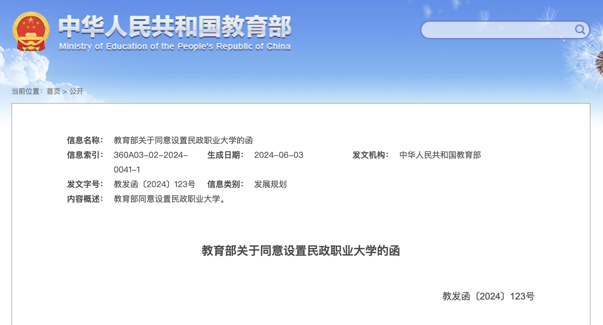 《民政部关于申请以北京社会管理职业学院为基础整合相关资源设立民政职业大学的函》(民函〔2023〕89号)收悉。根据《中华人民共和国高等教育法》《中华人民共和国职业教育法》《普通高等学校设置暂行条例》有关规定以及第八届全国高等学校设置评议委员会评议结果,经教育部党组会议研究决定,同意以北京社会管理职业学院为基础设立民政职业大学,学校标识码为4111014139;同时撤销北京社会管理职业学院的建制。现将有关事项函告如下。