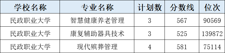 三个专业中,现代殡葬管理专业投档分最高,为581分,位次:75114,无选科要求;康复辅助器具技术投档分最低,为525分,位次:139872,24年选科要求为物理。