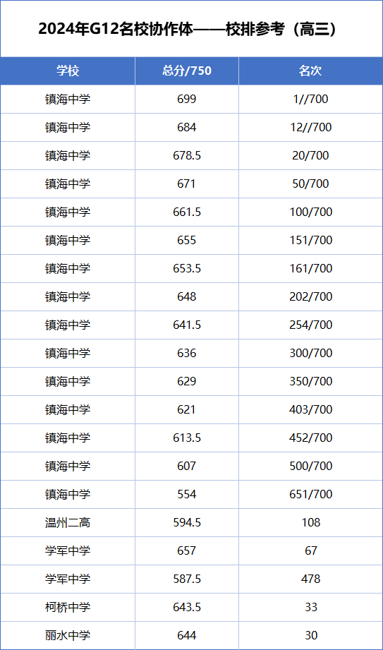 镇海中学最高分699,校内排第一;另外更新了学军和柯桥中学、丽水中学的校排名。