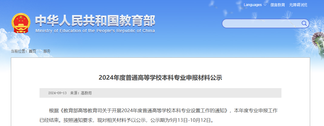 根据《教育部高等教育司关于开展2024年度普通高等学校本科专业设置工作的通知》,本年度专业申报工作已经结束。按照通知要求,现对相关材料予以公示,公示期为9月13日-10月12日。