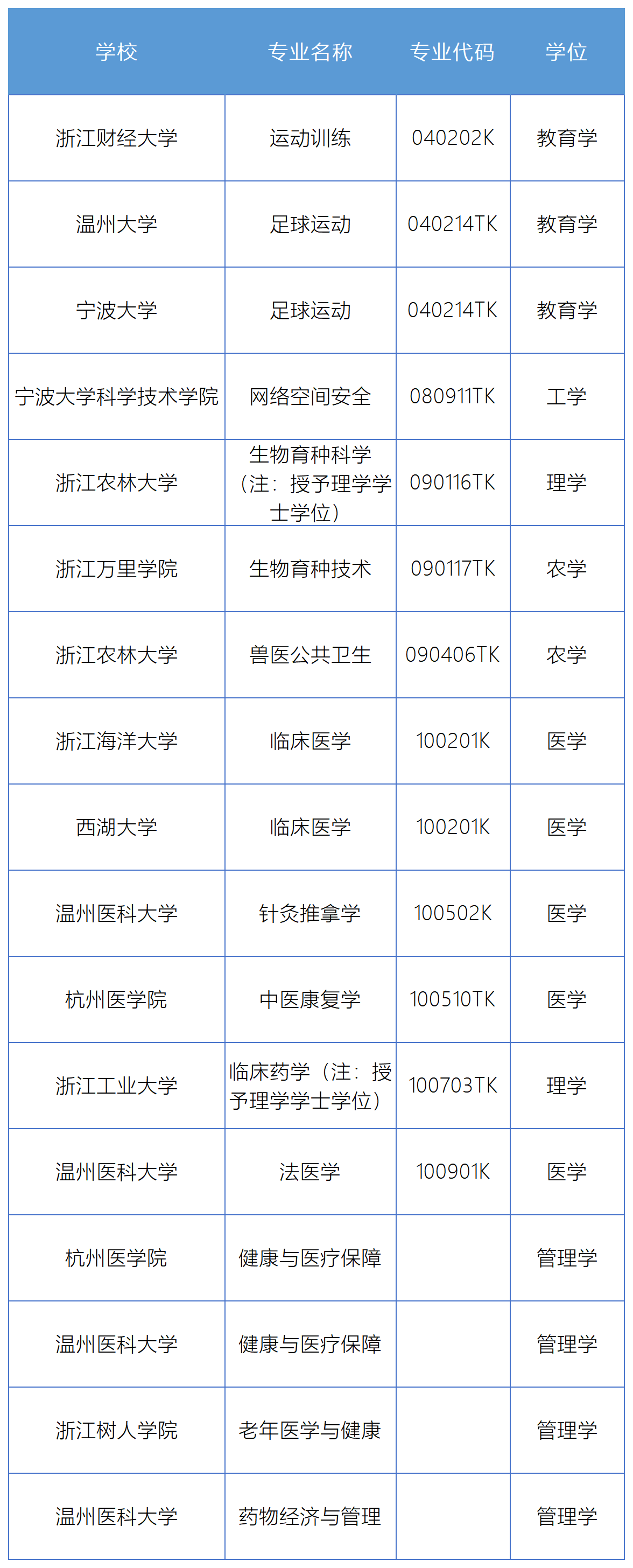 其中,申报数量最多的高校是温州医科大学,申报4个专业,其次浙江农林大学、杭州医学院2个,以及浙江财经大学、温州大学、宁波大学、宁波大学科学技术学院、浙江万里学院、浙江海洋大学、西湖大学、浙江工业大学、浙江树人学院各1个。