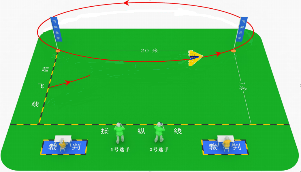 (3)模型起飞后选手需站到操纵线外操纵模型,以逆时针方向绕标杆飞行,漏标可以原路返回补绕,未补绕者此圈不计为有效圈。