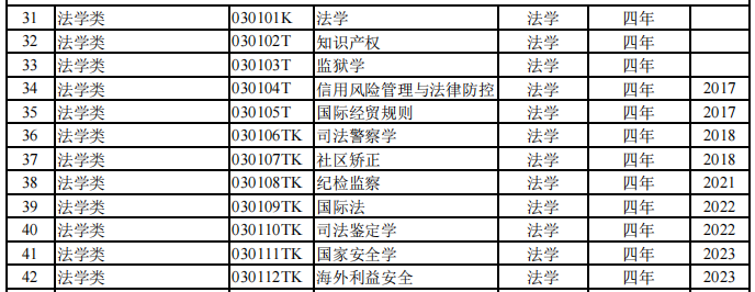 法学类专业包括法学、知识产权、监狱学、信用风险管理与法律防控、国际经贸规则、司法警察学、社区矫正等12个专业。