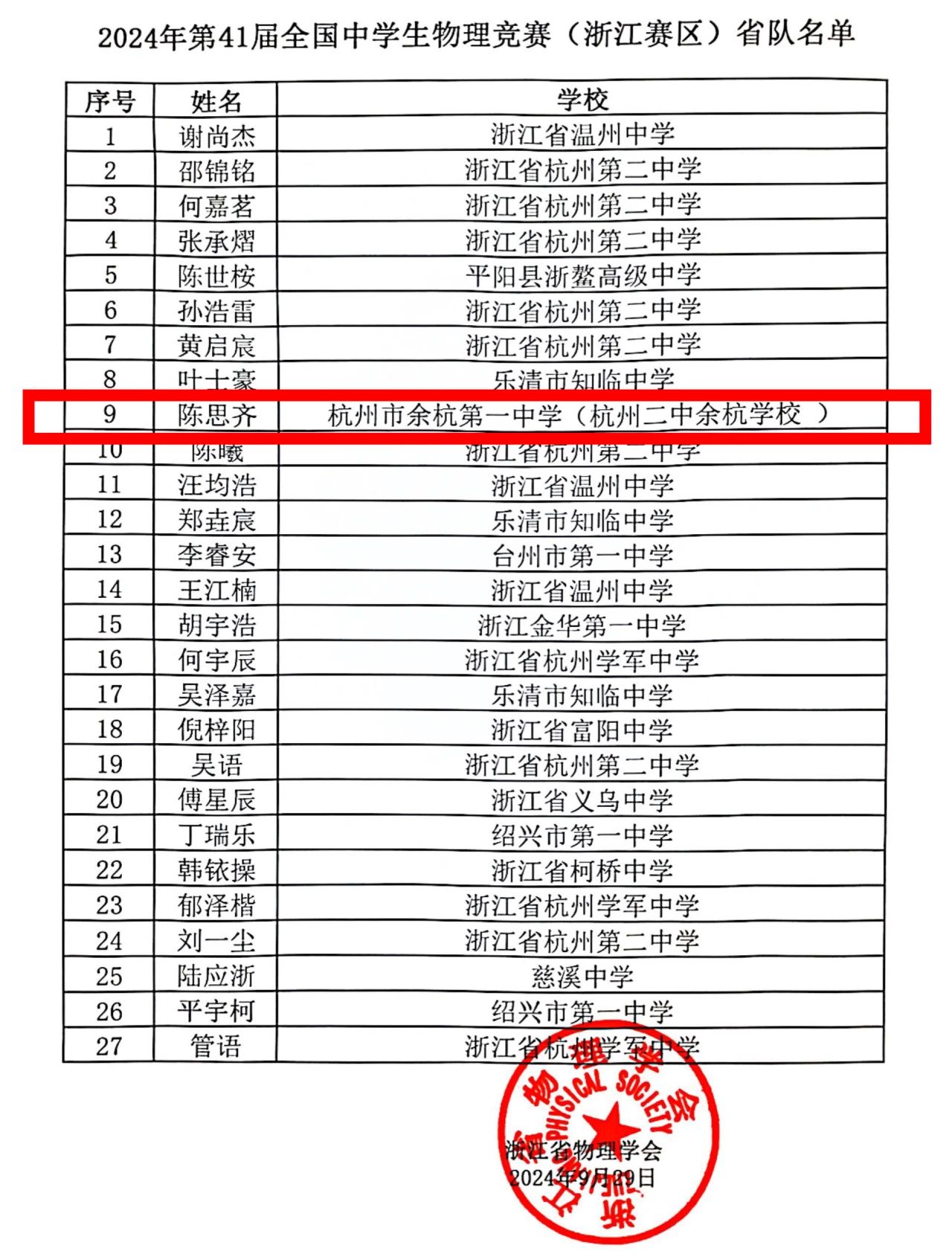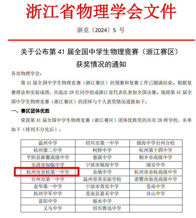 近日,第41届全国中学生物理竞赛(浙江赛区)获奖情况公布,余杭一中物理竞赛复赛获佳绩,7人获奖,1人入选省队,自主选拔在线浙江新高考团队整理了相关内容,供考生择校了解!