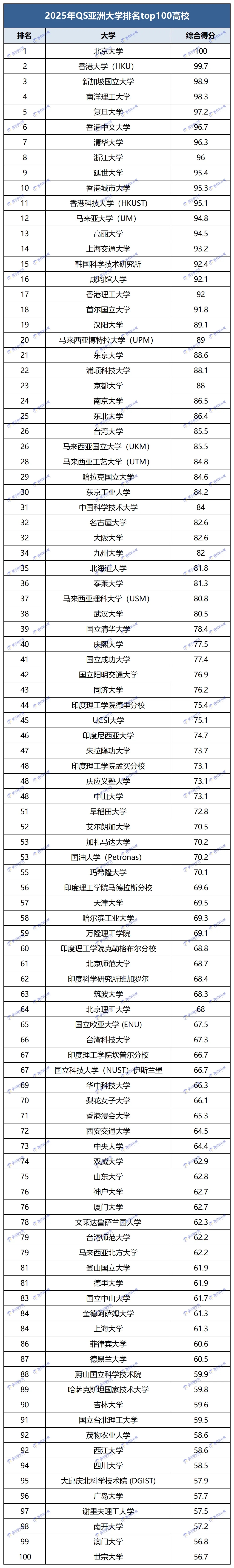 QS发布的2025亚洲大学排名中,中国、日本、韩国、新加坡高校表现依旧强势,而亚洲高校TOP10中,更是有7所中国高校。