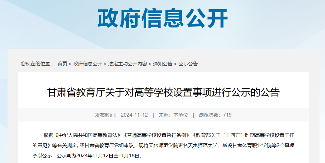 11月12日,甘肃省教育厅发布《关于对高等学校设置事项进行公示的公告》,将天水师范学院更名天水师范大学、新设甘肃体育职业学院等2个事项予以公示。备受期待的“天水师范大学”终于要来了!