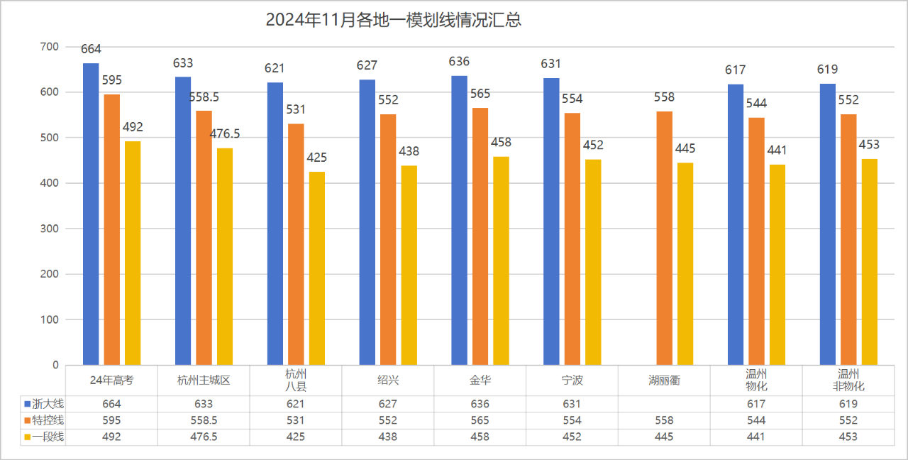 浙大线、特控线和一段线是我们进行定位的重要参考。一般说来,平时的模拟考难度往往会比高考略难,改卷更严格一些。因此,各条线的也比往年高考会低出一些。大家可以参考当地的划线情况,并与之和24年数据作对比,做好定位。