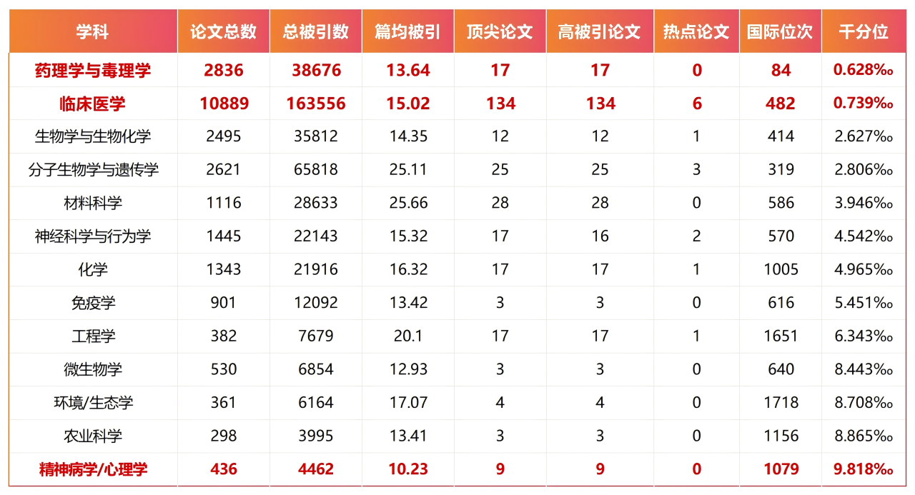 近日,科睿唯安公布了2024年11月ESI排名,我校学科建设再创佳绩,新增精神病学与心理学学科进入ESI全球排名前1%。截至目前,我校已有13个学科进入ESI全球排名前1%,其中药理学与毒理学、临床医学2个学科进入前1‰,综合排名在全球9533个上榜机构中位列611位,进入全球排名前6.9%。国内排名第74位,位居独立设置医科大学第5。药理学与毒理学进入ESI全球排名前0.628‰,临床医学进入ESI全球排名前0.739‰,其他学科排名均有显著提升。
