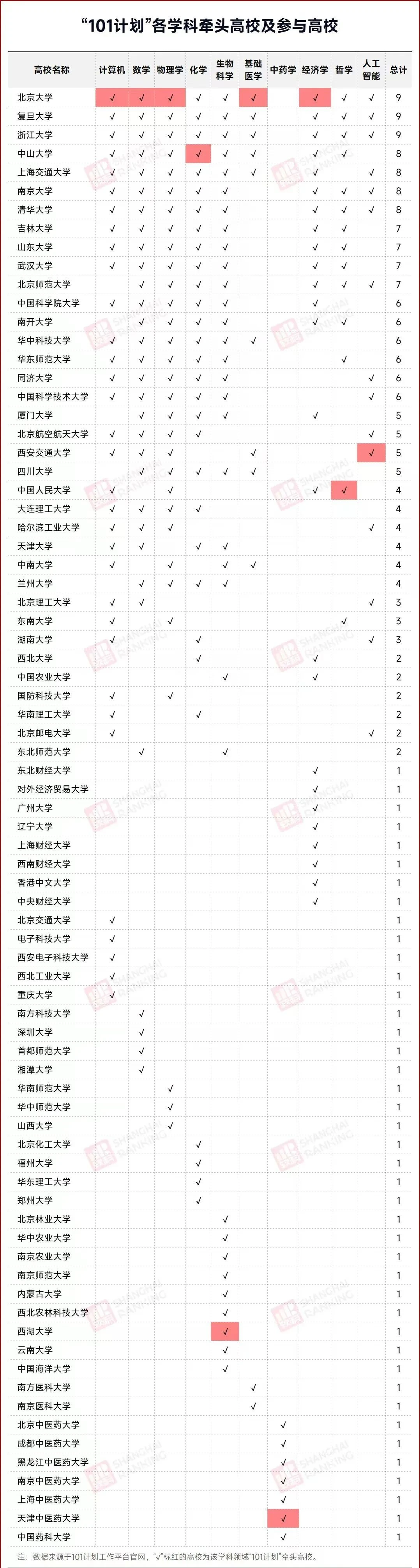 据“101计划工作平台”官网及官媒公布信息显示,截至目前有10个学科领域共有78所高校入选:计算机有33所高校、数学共31所高校、物理学有31所高校、经济学有25所高校、基础医学有11所高校、化学有30所高校、生物科学33所高校、中药学有7所高校、哲学有14所高校、人工智能有15所高校。