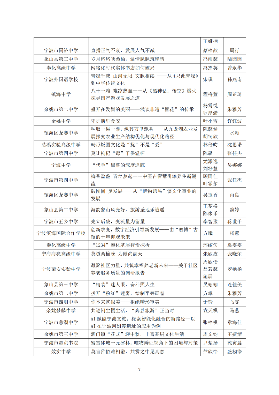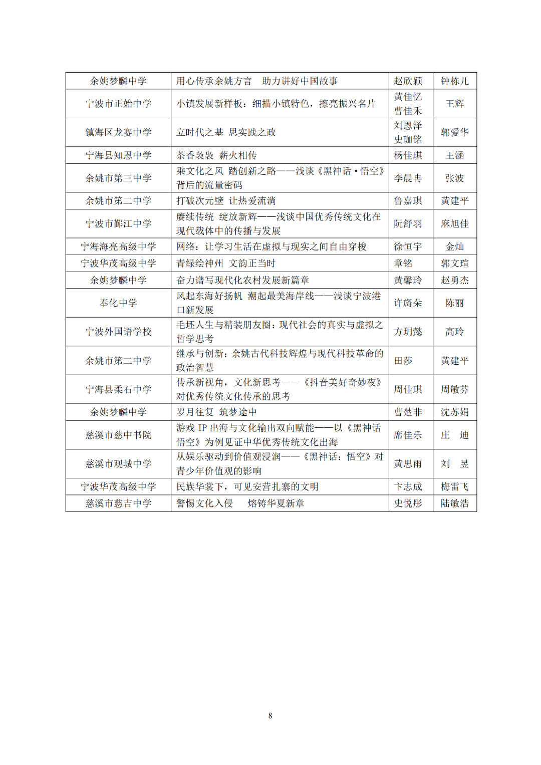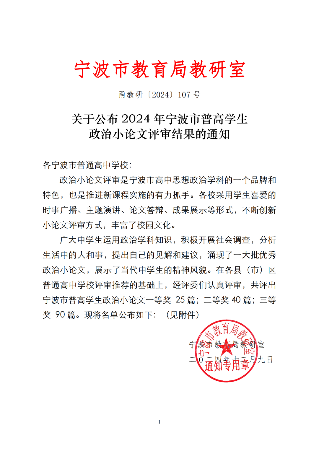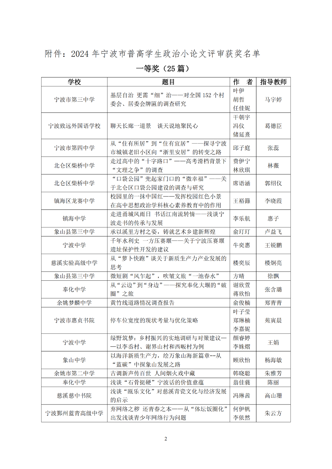 关于公布2024年宁波市普高学生政治小论文评审结果的通知: