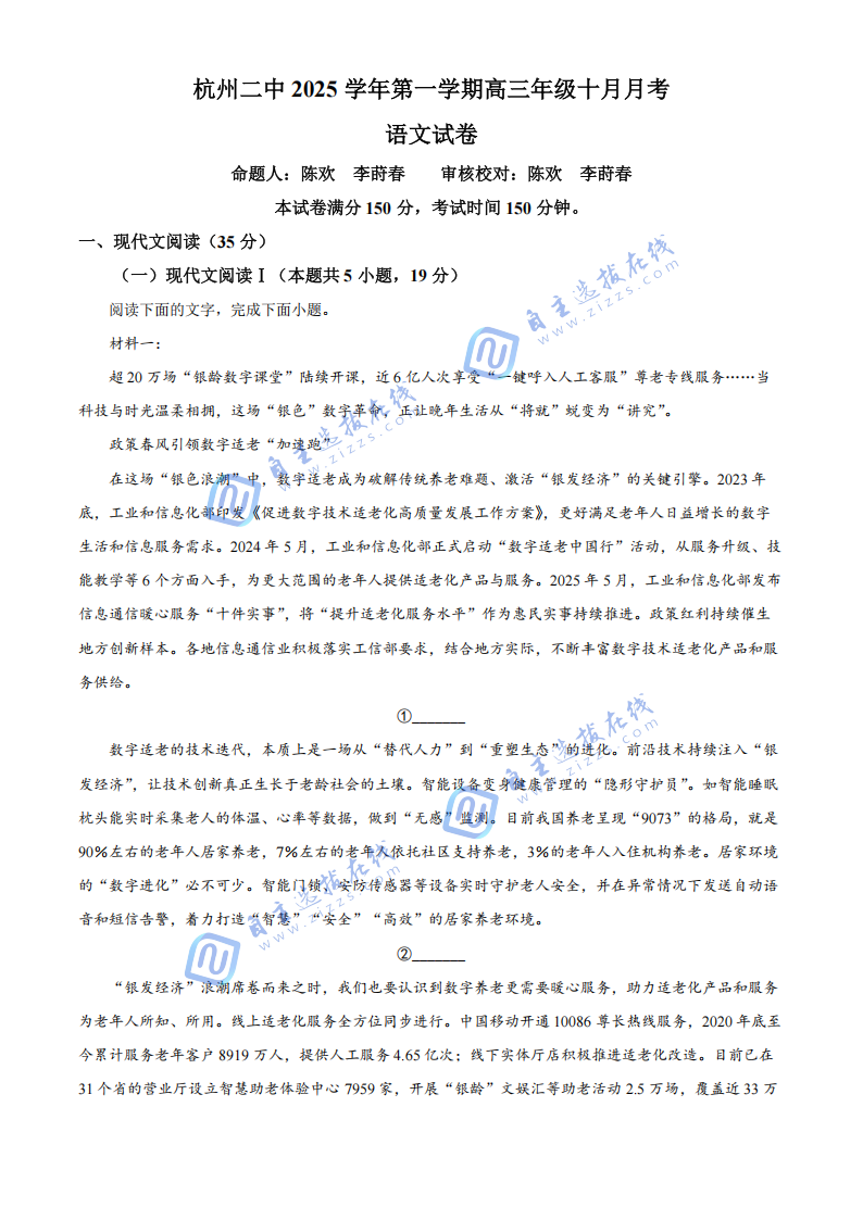 浙江省杭州市第二中学2026届10月月考语文科目近日考试!本次月考试题全面考查学生的文学素养、文本解读与批判性思维能力,作文主题深刻,紧扣时代脉搏,旨在引导考生关注现实、深化思考。自主选拔在线团队整理浙江省杭州市第二中学2026届10月月考语文试题及答案相关内容,一起来看!