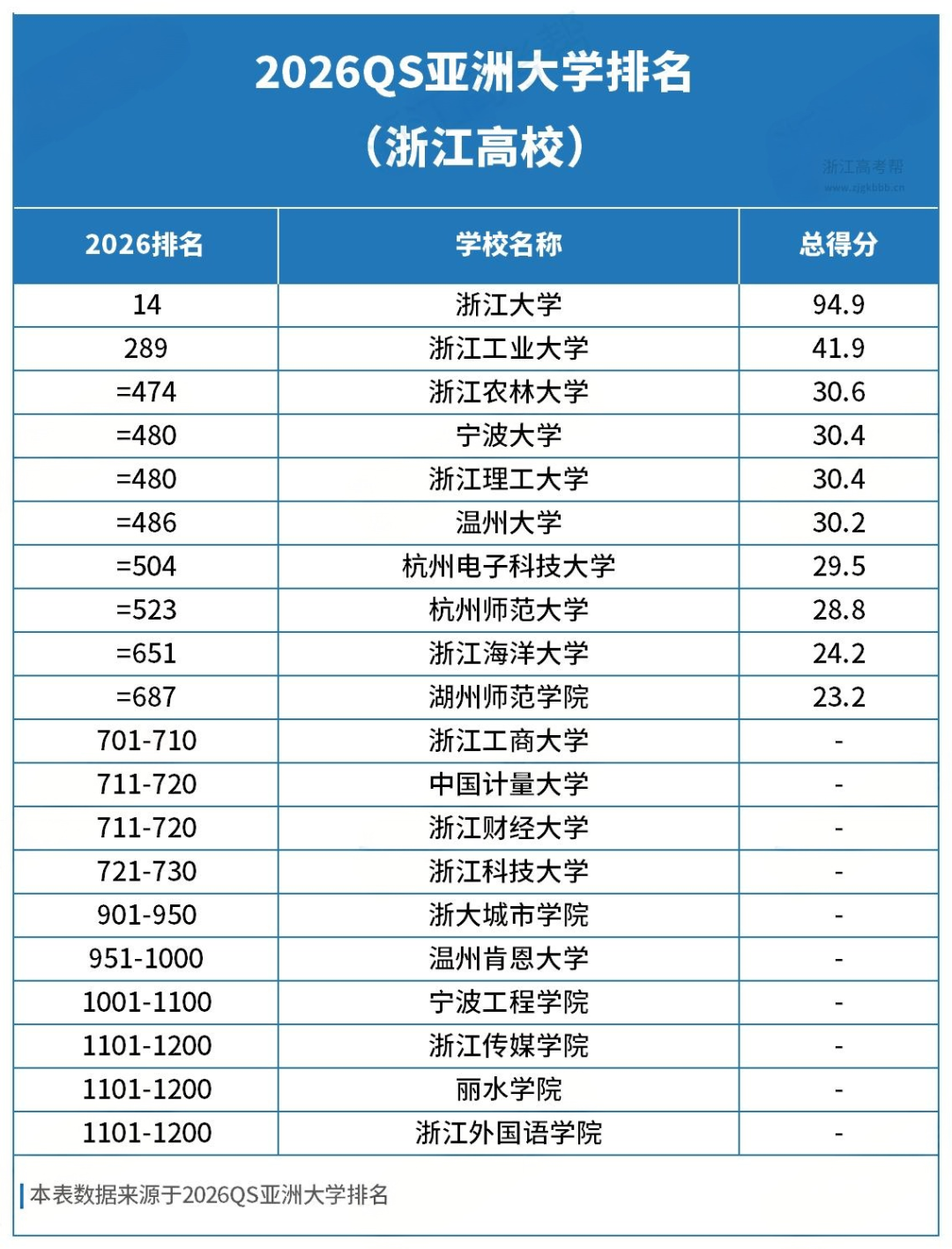 2026QS亚洲大学排名公布!浙江20所上榜