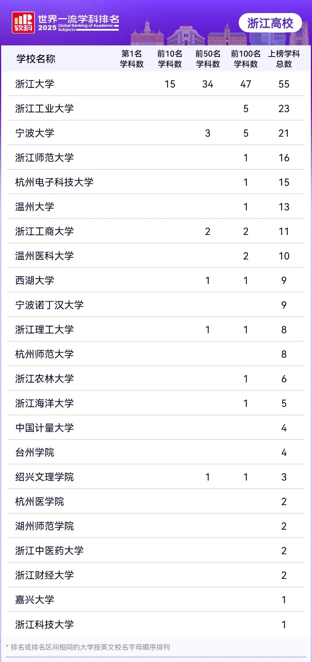 2025年软科世界一流学科排名浙江23高校230个学科上榜