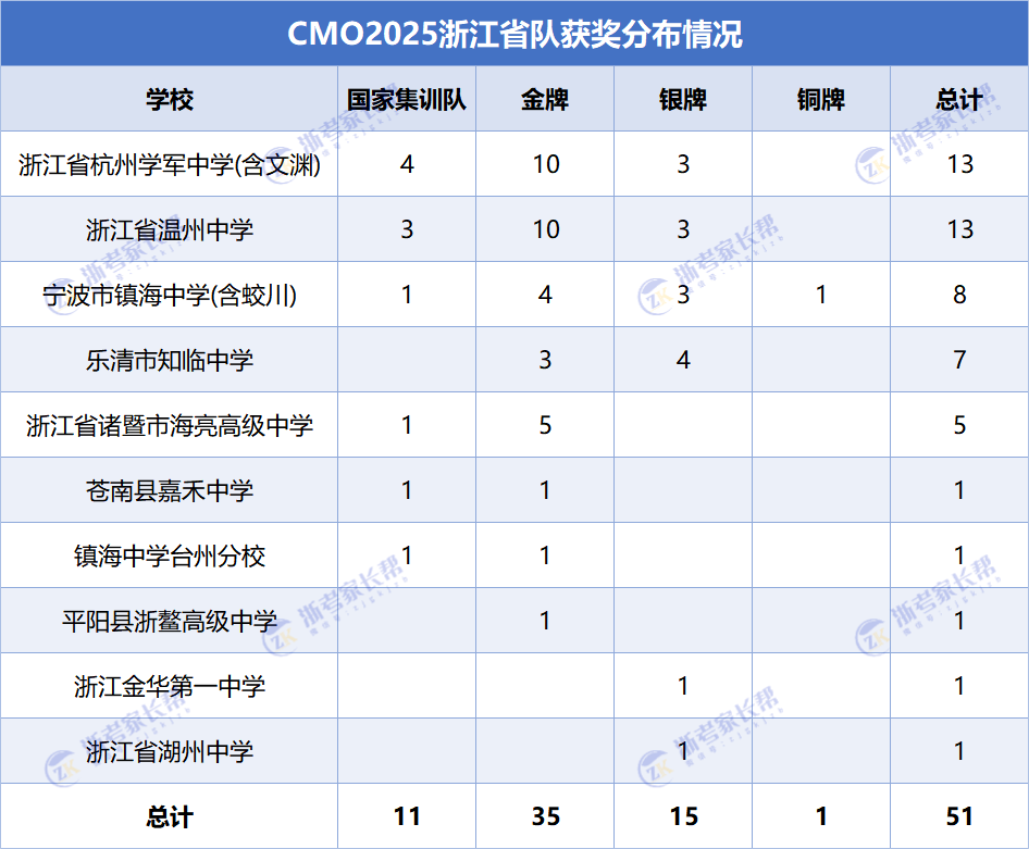 1.浙江省队51人摘得35枚金牌、15枚银牌、1枚铜牌,11人顺利入选国家集训队。
