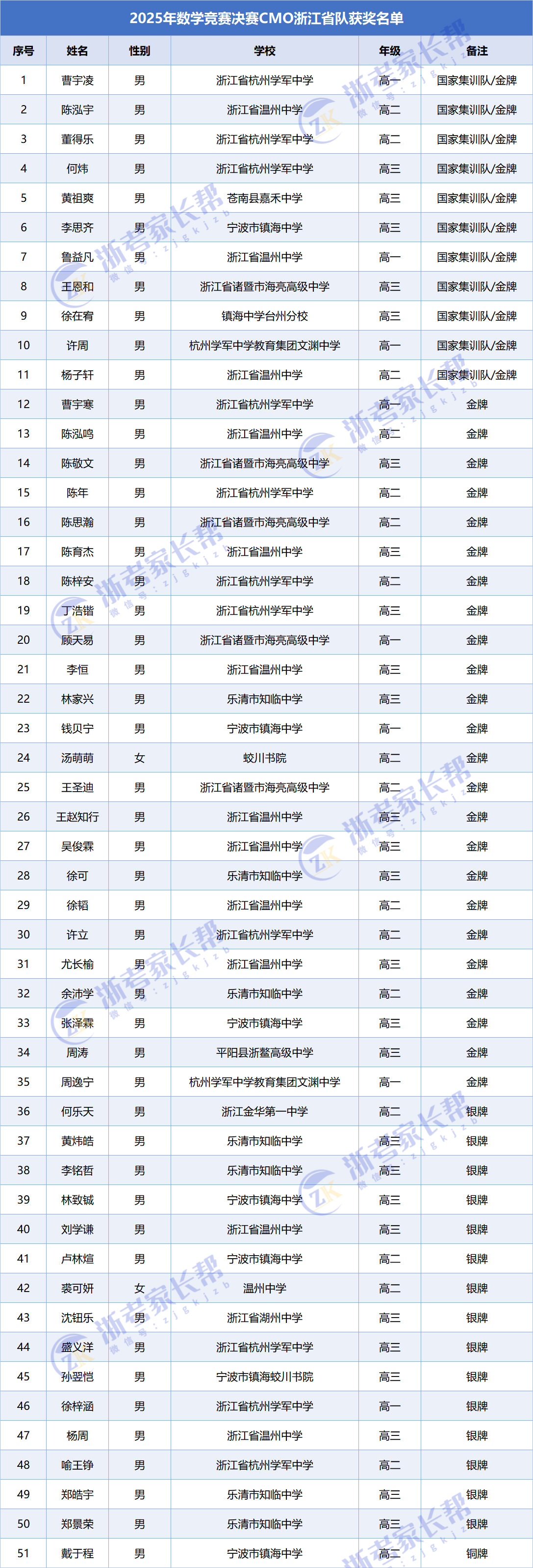2025年第41届中学生数学奥林匹克竞赛决赛获奖名单已经公布,金牌223人,银牌293人,铜牌194人。浙江共11名考生入选国家集训队,并获得清华北大的保送资格,分别来自学军中心、温州中学、诸暨海亮中学、镇海中学(含蛟川)、苍南县嘉禾中学、镇海台州分校。自主选拔在线团队再次恭喜各位同学!以下是完整获奖名单,一起来看!