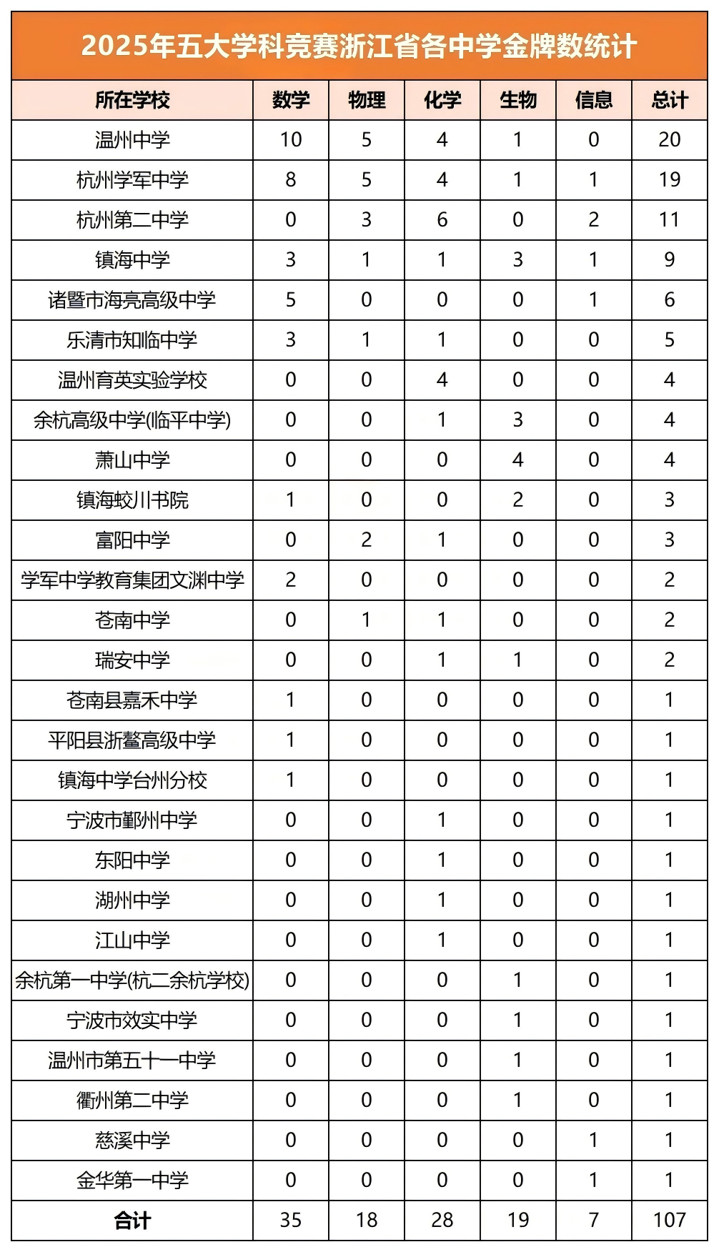 数学是金牌最多的学科(35 枚),温州中学、杭州学军中学、诸暨海亮高中是数学金牌主力;化学(28 枚)次之,杭州二中(6 枚)、温州育英实验学校(4 枚)表现突出;信息学金牌最少(仅 7 枚),且集中在少数学校(如杭州学军、镇海中学)。