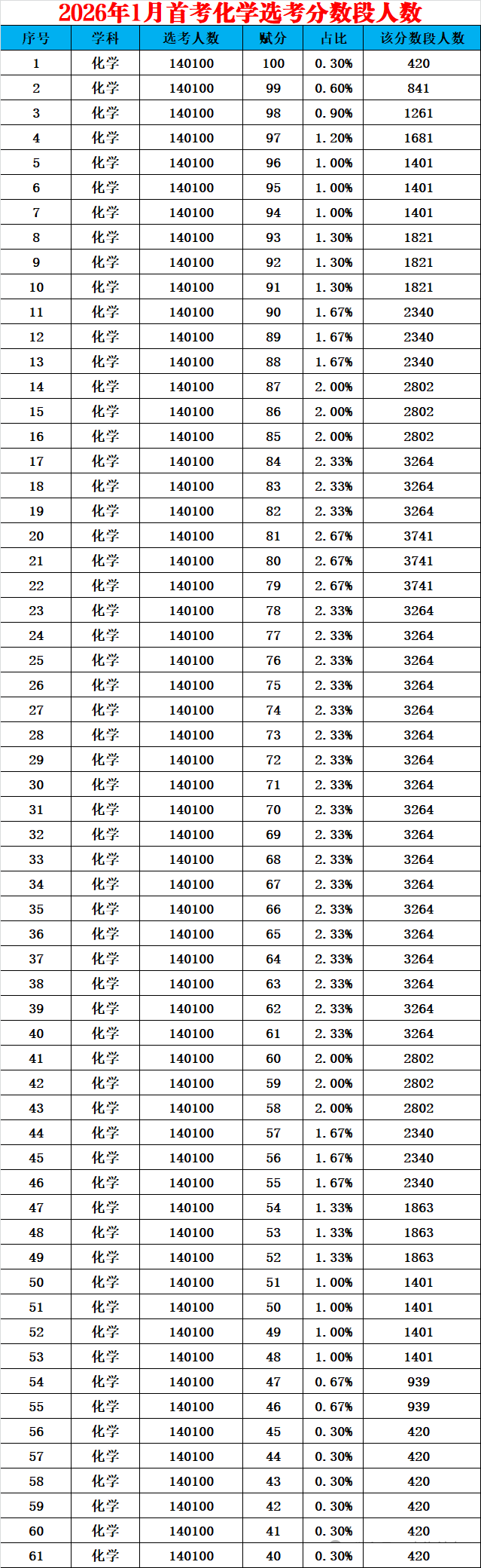 根据浙江省普通高中选考赋分规则,2026年1月化学选考,100分的人数将达到420人,99分的人数约为841人,98分的人数为1261人。97分的人数约为1681人。94分至96分的人数约为1401人。