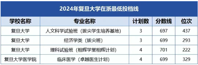 2023年复旦大学在浙江普通批录取中,理科试验班最低分699分(位次204),人文科学试验班697分(位次280),整体最低录取线697分。